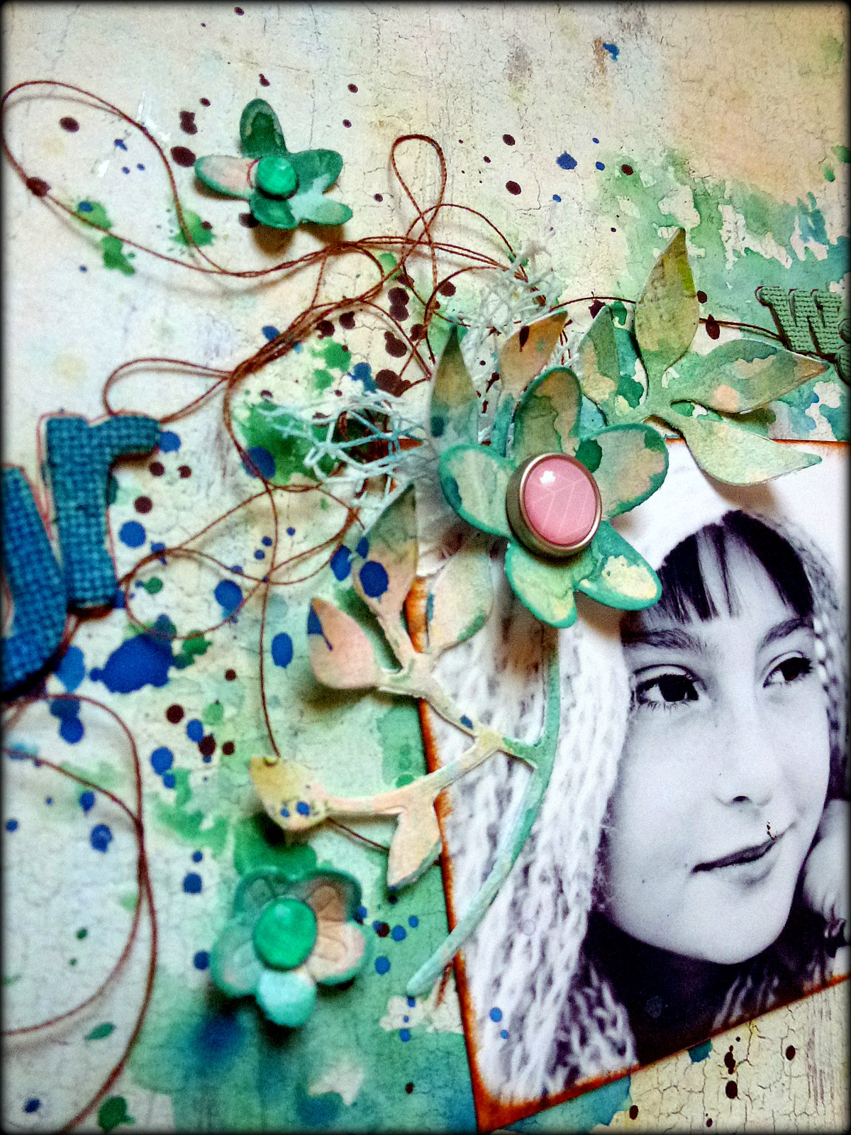 I then glued a cluster of 3 flowers over the distressed trim. I further embellished these flowers with some of the fabulous Sunrise Sunset Vintage Trinkets.