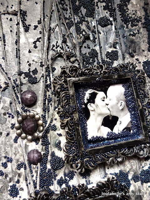 • Remove protective card from photo, sprinkle on mini sequins over areas of splated liquid adhesive and shake off excess, allow to dry.
